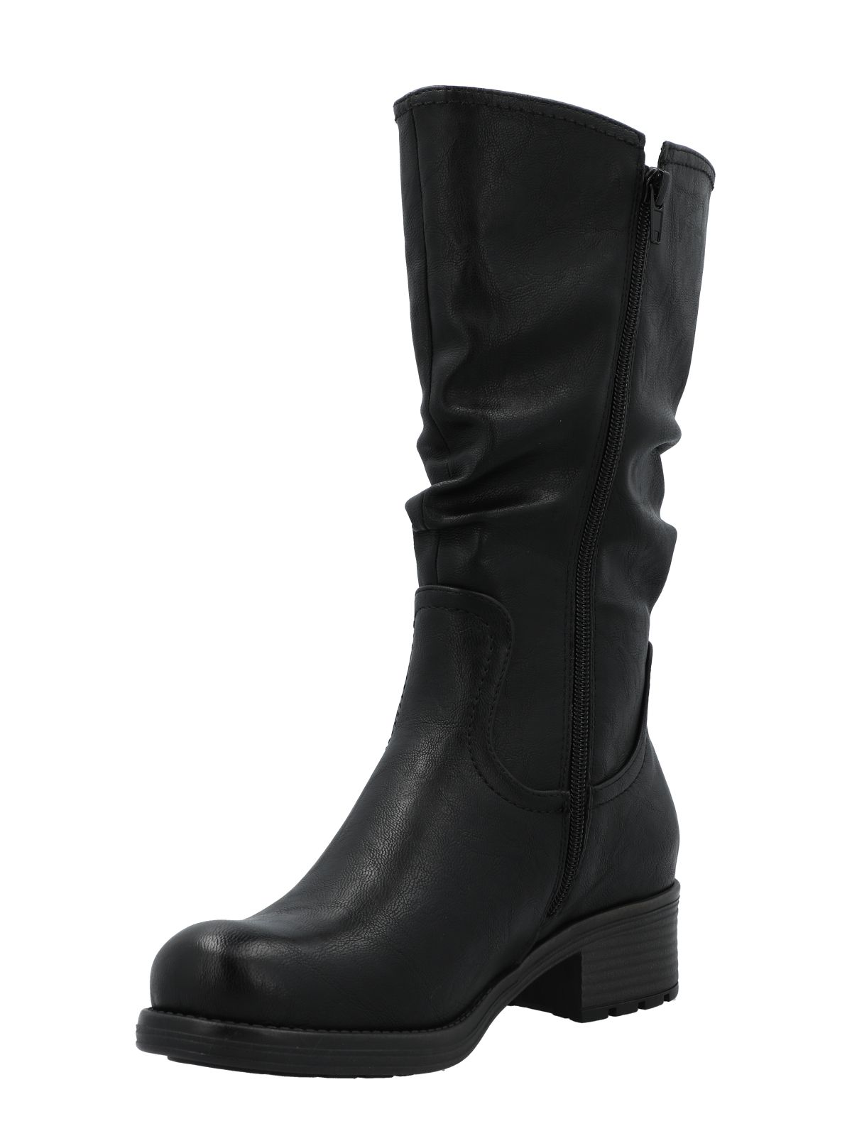 Bota mujer Azaleia. Destaca por su diseño en color negro con efecto arrugado en la caña que le aporta estilo y personalidad. La plantilla en cuero extra acolchada brinda amortiguación y confort en cada paso, mientras que el cierre interior completo permite un ajuste perfecto para distintos tipo de pantorrilas, combinando elegancia y comodidad en todo momento.