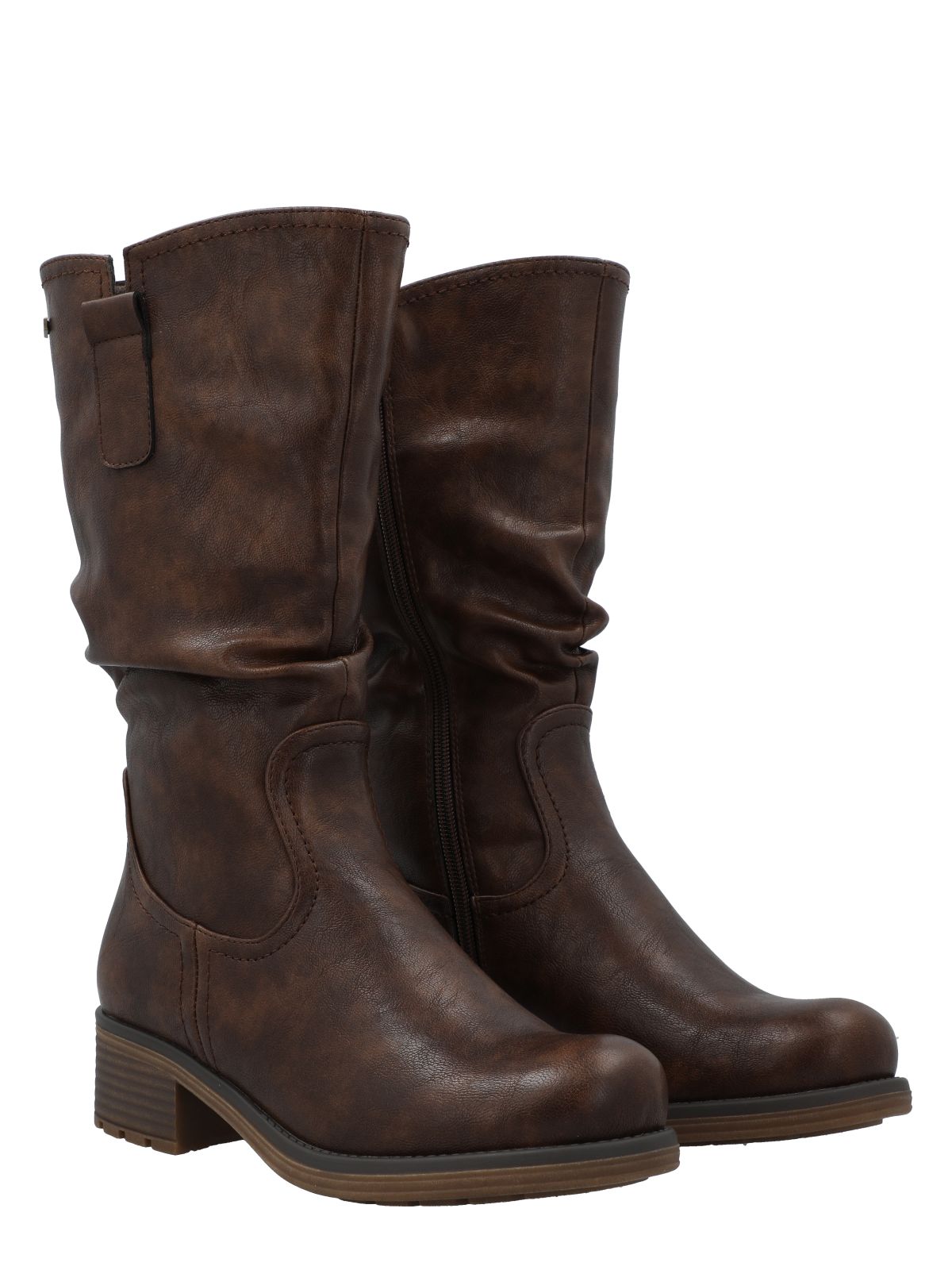 Bota mujer Azaleia. Destaca por su diseño en color cafe con efecto arrugado en la caña que le aporta estilo y personalidad. La plantilla en cuero extra acolchada brinda amortiguación y confort en cada paso, mientras que el cierre interior completo permite un ajuste perfecto para distintos tipo de pantorrilas, combinando elegancia y comodidad en todo momento.