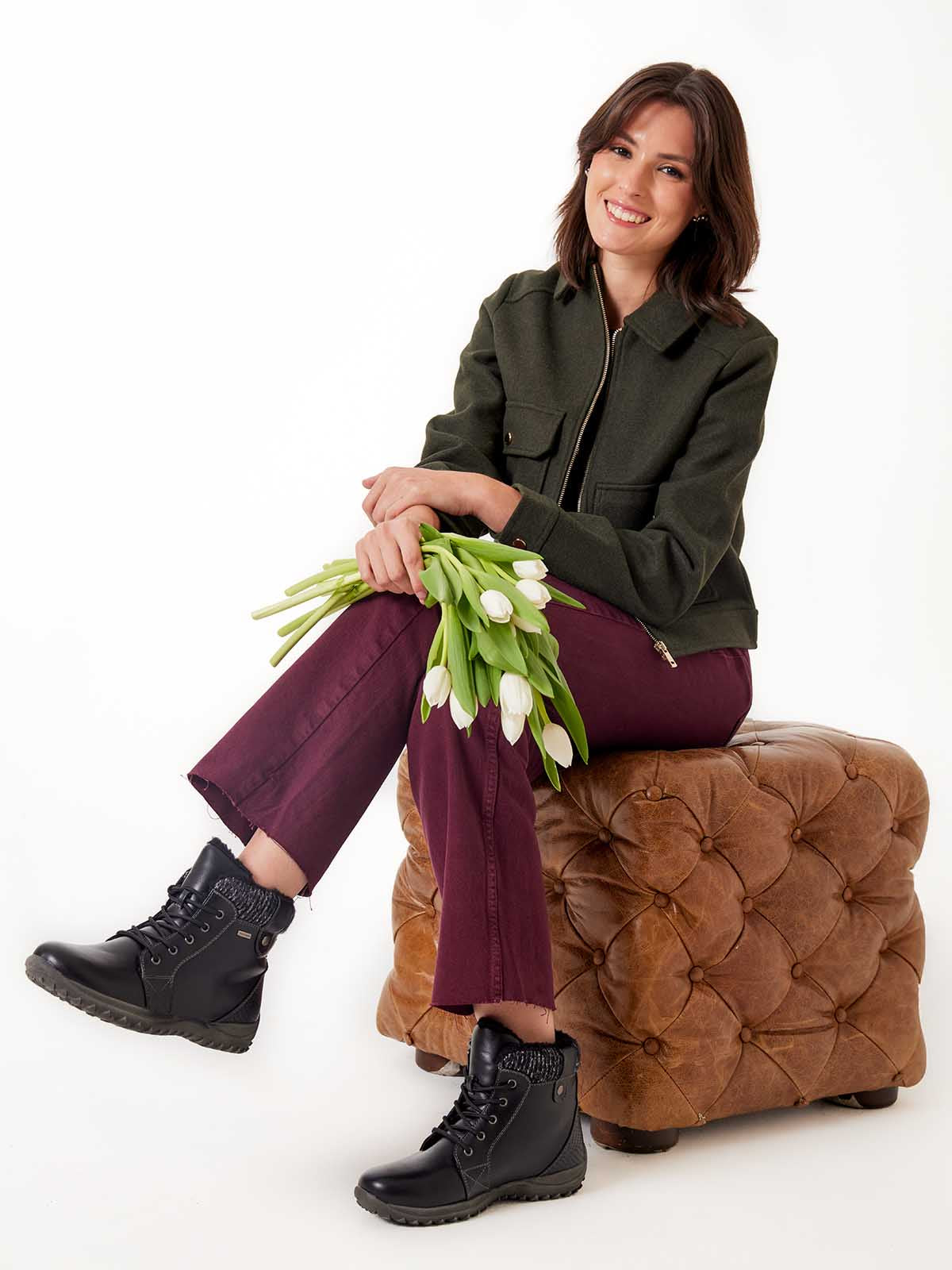 Botín mujer Azaleia con plantilla de cuero de alta densidad que otorga soporte, durabilidad y transpirabilidad, evitando la acumulación de sudor. Forro de chiporro desde la punta del pie hasta el tobillo, decoración con textura snake en talonera y lana en tobillo, cordones de ajuste.