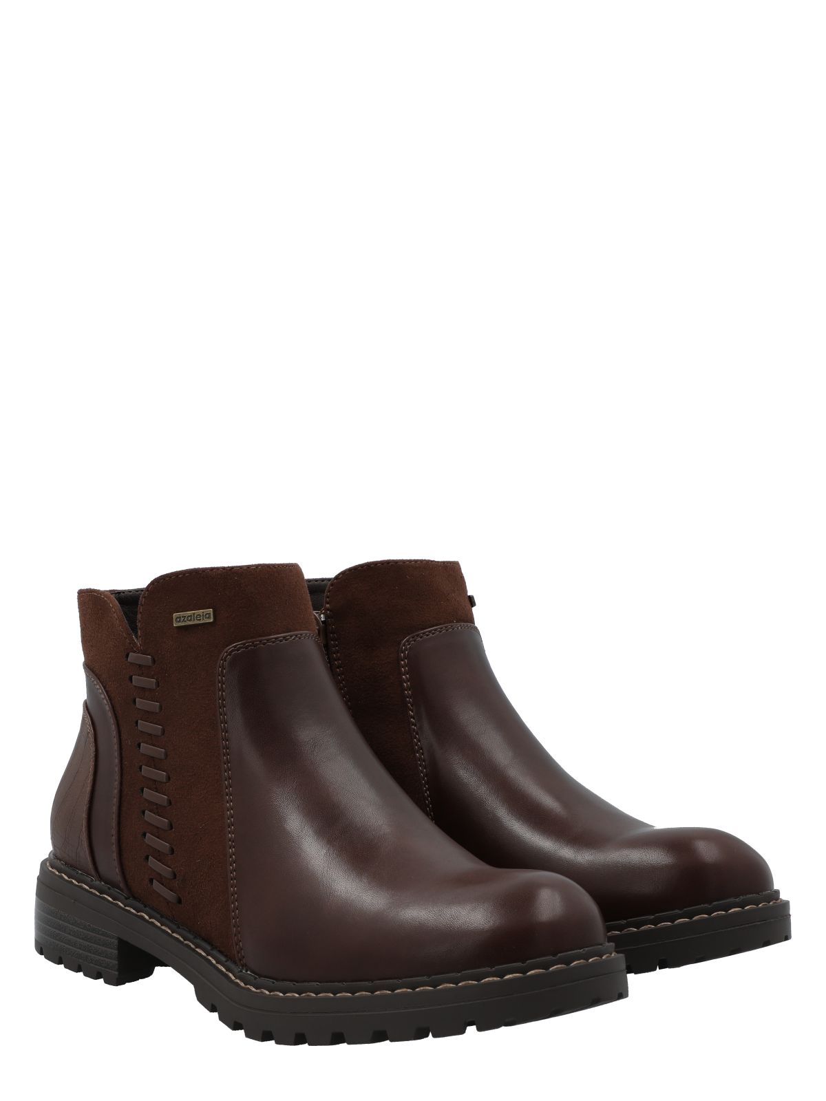 Botín mujer Azaleia. Destaca por su diseño en color café estilo chelsea, con una mezcla de texturas que transmiten modernidad y carácter. Su plantilla de cuero brinda suavidad y amortiguación en cada paso, garantizando confort durante todo el día.
