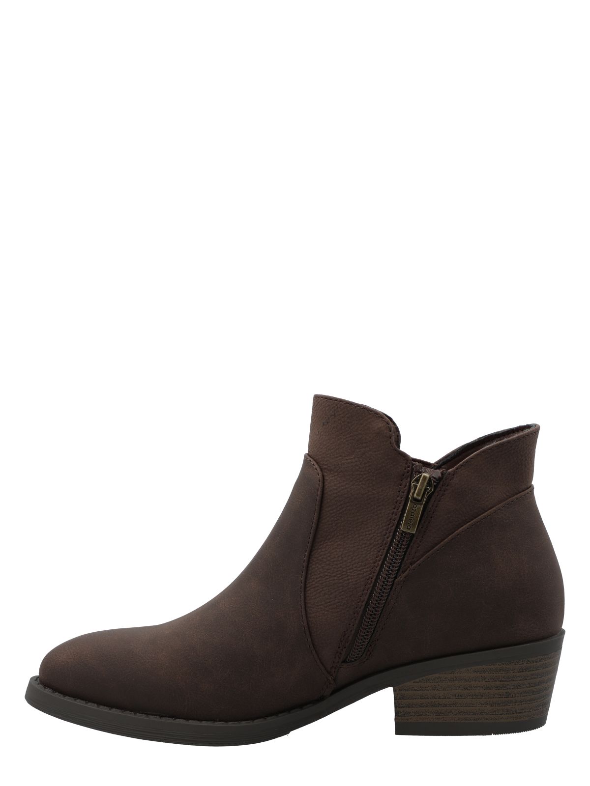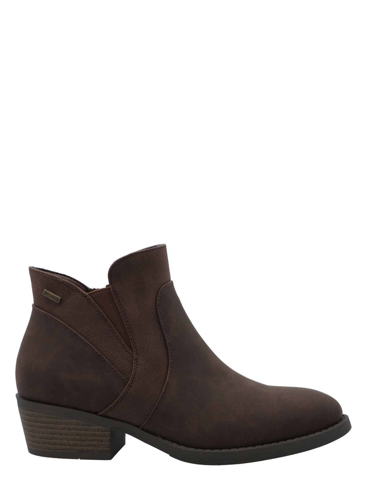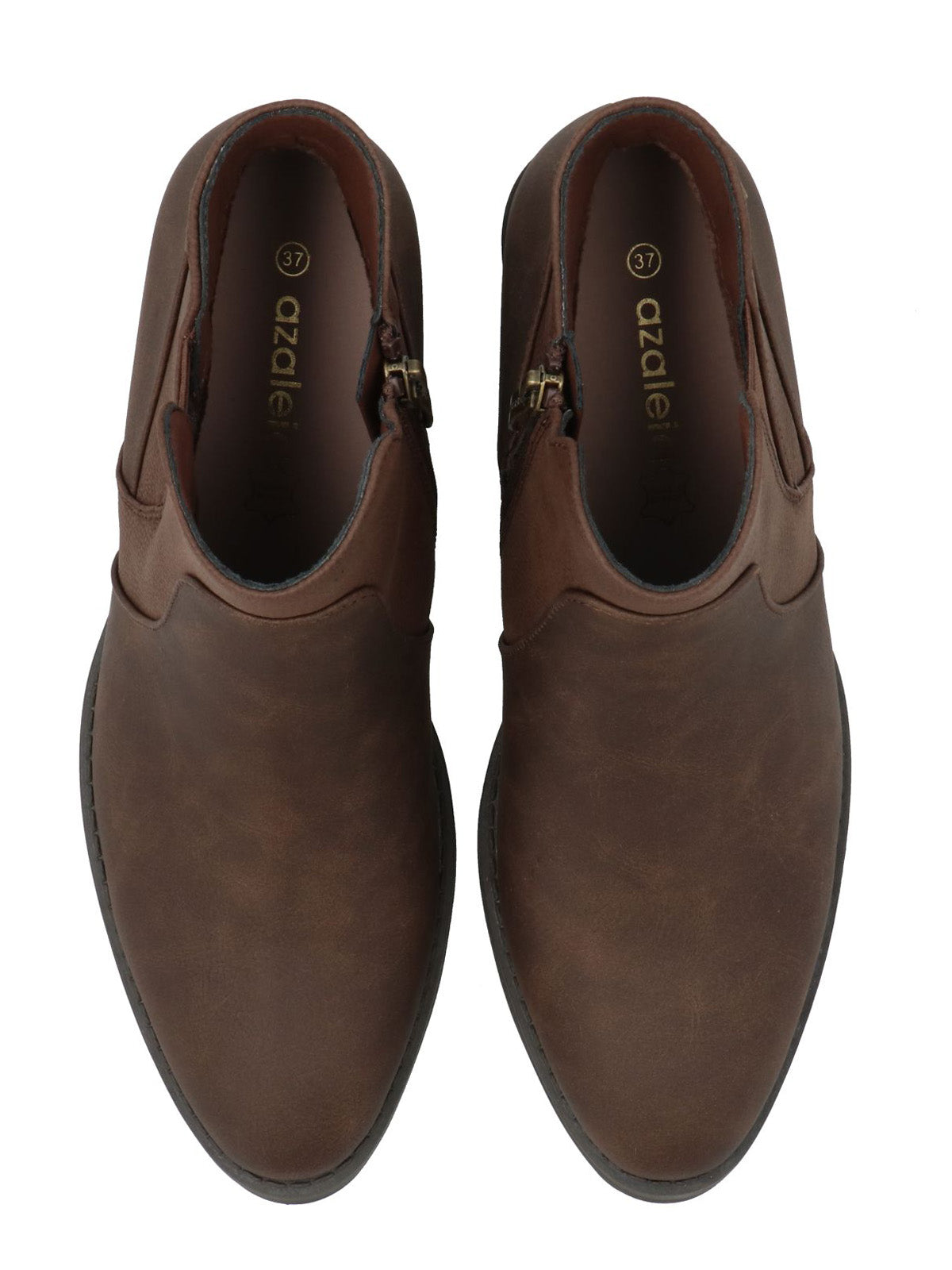Botín mujer Azaleia. Destaca por su diseño en color café, con detalles elásticos laterales que facilitan el calce y aportan un toque distintivo. Su plantilla de cuero ofrece suavidad y amortiguación en cada paso, brindando comodidad durante todo el día. Un botín práctico y estiloso para acompañarte en la temporada de invierno.