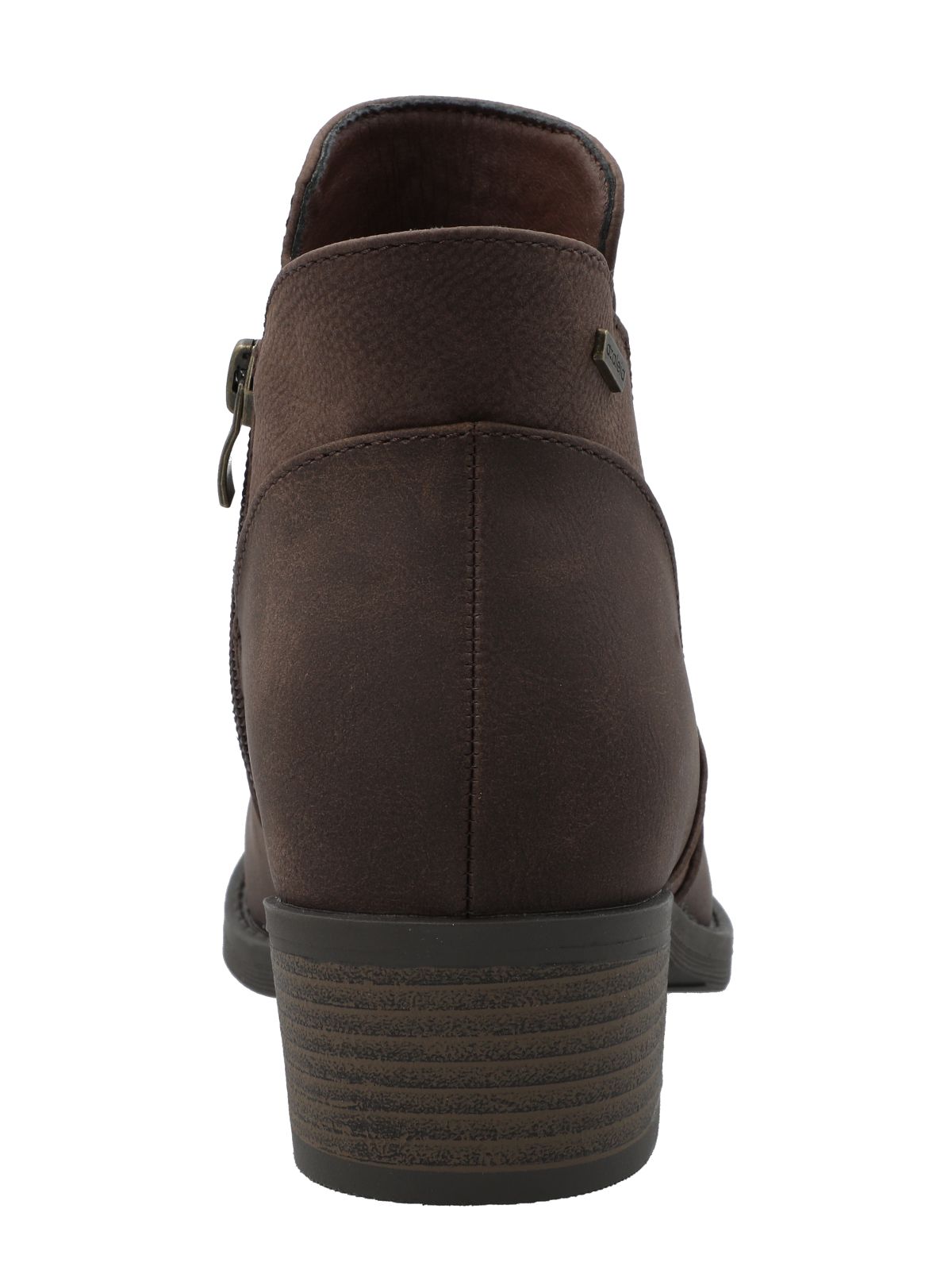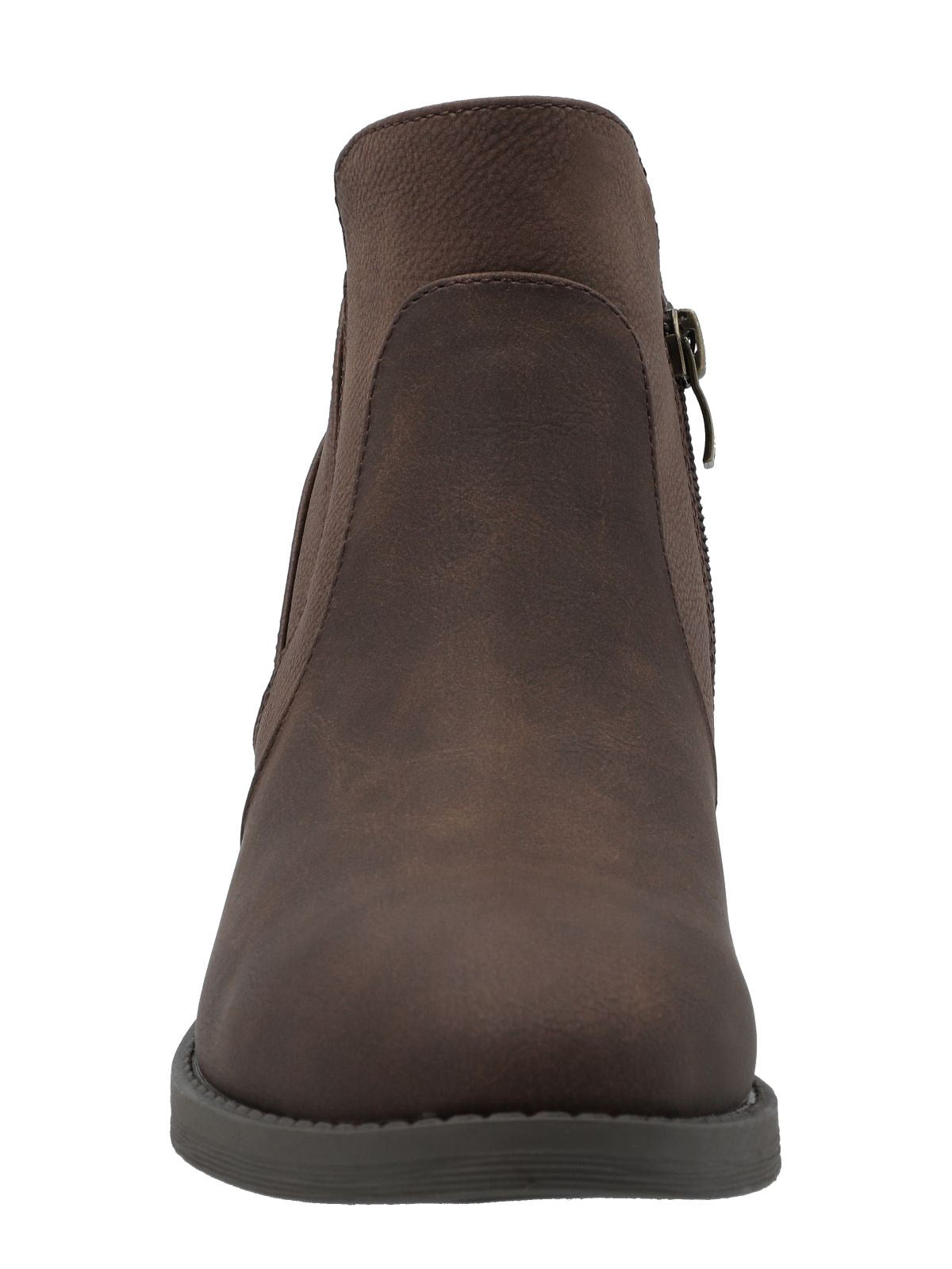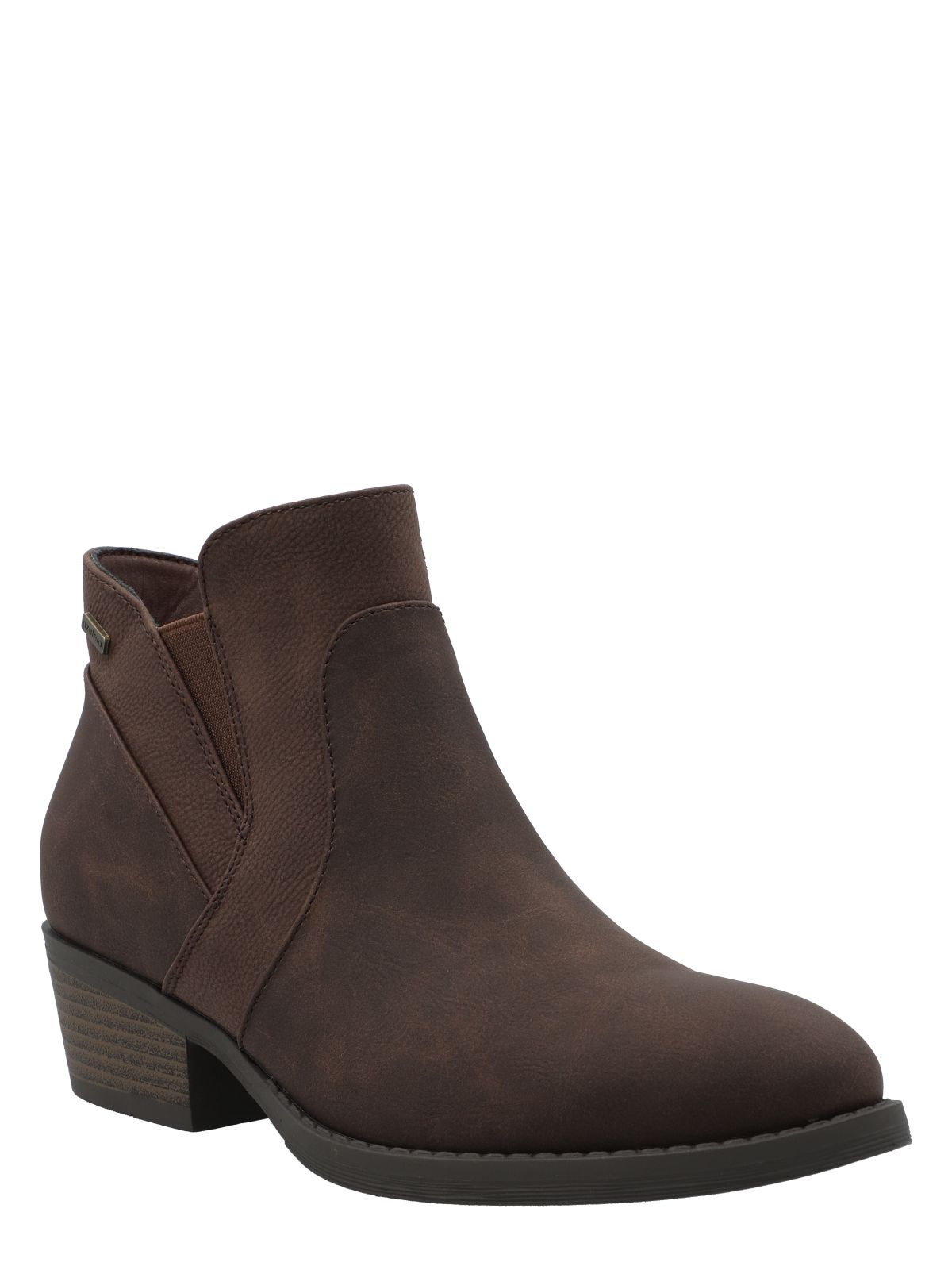 Botín mujer Azaleia. Destaca por su diseño en color café, con detalles elásticos laterales que facilitan el calce y aportan un toque distintivo. Su plantilla de cuero ofrece suavidad y amortiguación en cada paso, brindando comodidad durante todo el día. Un botín práctico y estiloso para acompañarte en la temporada de invierno.