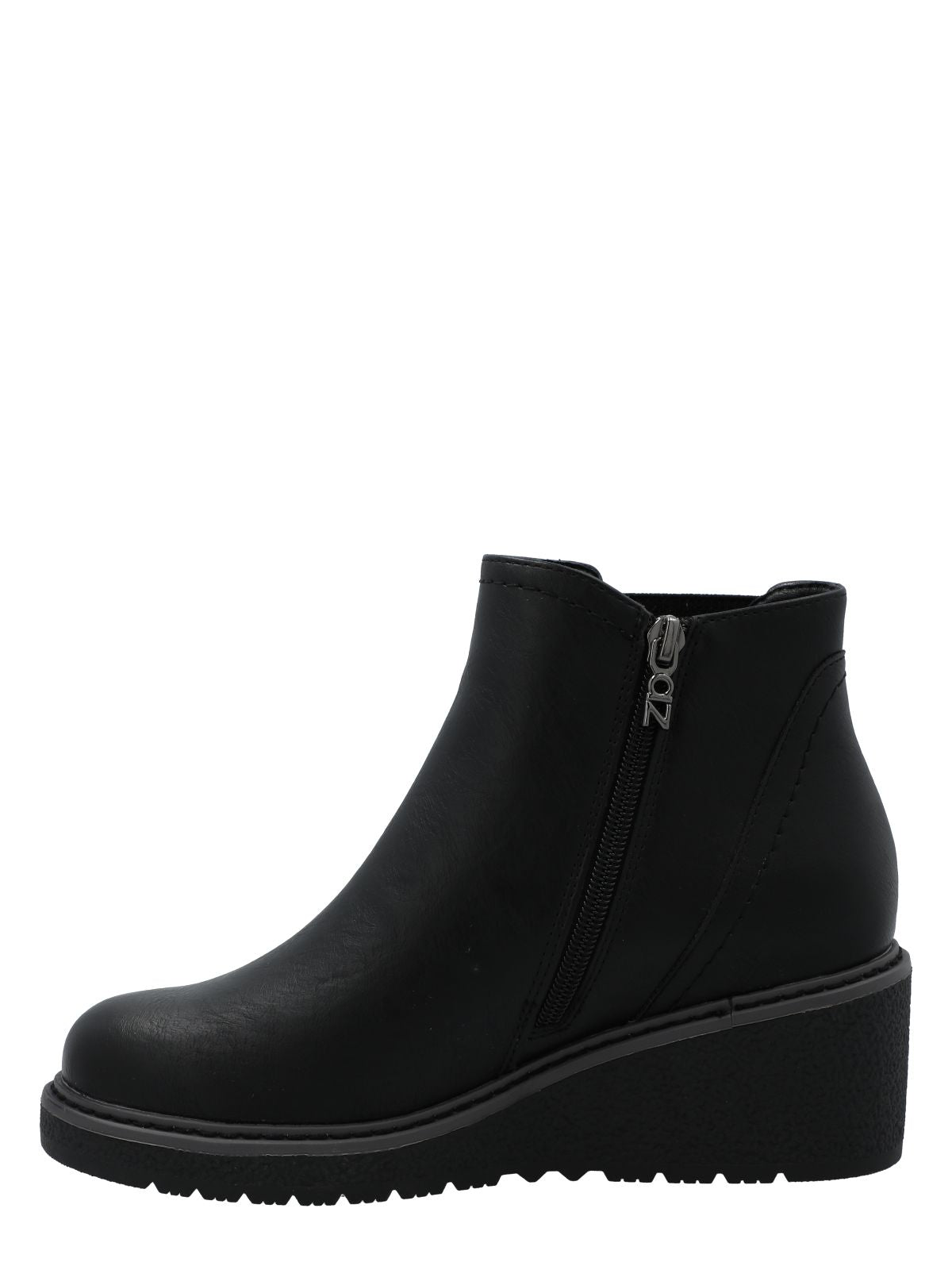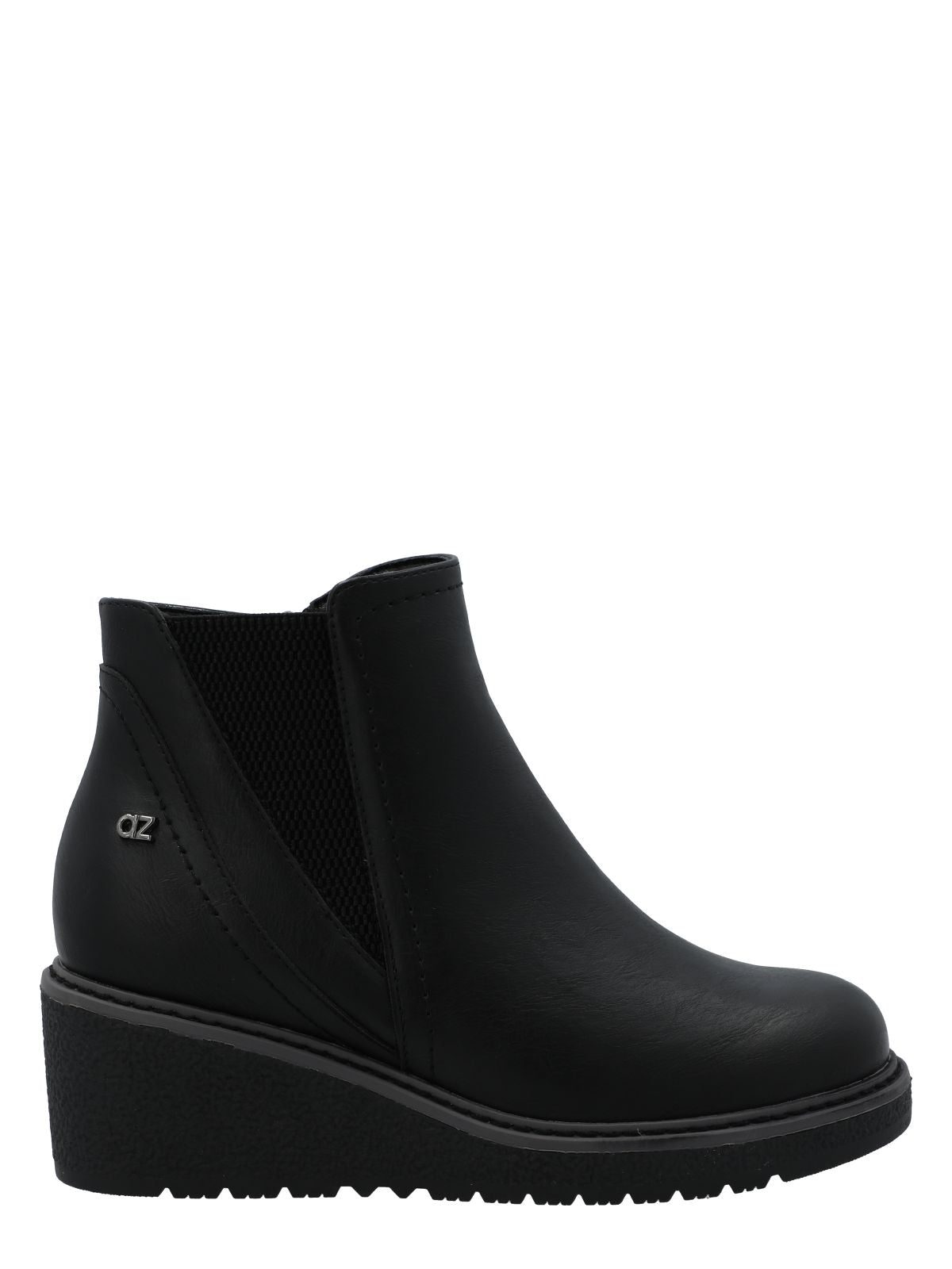 Botín mujer Azaleia. Destaca por su diseño en color negro con diseño estilo Chelsea y suela en cuña para un look moderno y cómodo. Cuenta con panel elástico en un costado y cierre en el otro, lo que facilita el calce y aporta practicidad para el uso diario.