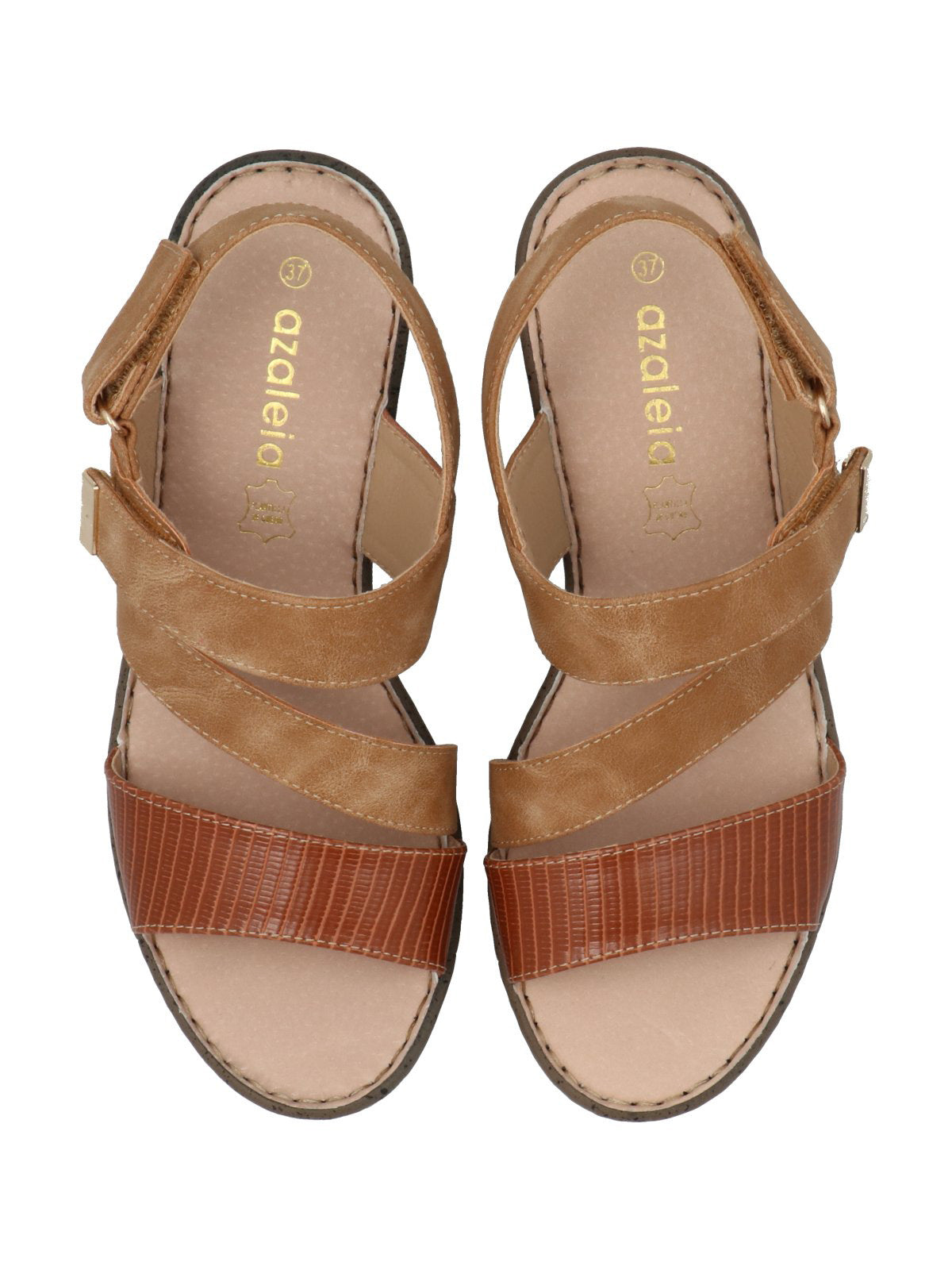 Sandalia mujer Azaleia con plantilla de cuero para evitar la humedad de los pies, combina tendencias actuales con funcionalidad. El taco tipo cuña proporciona el equilibrio perfecto entre altura y comodidad.Tiene correa con velcro en el empeine que permite adaptarse a cualquier tipo de pie.